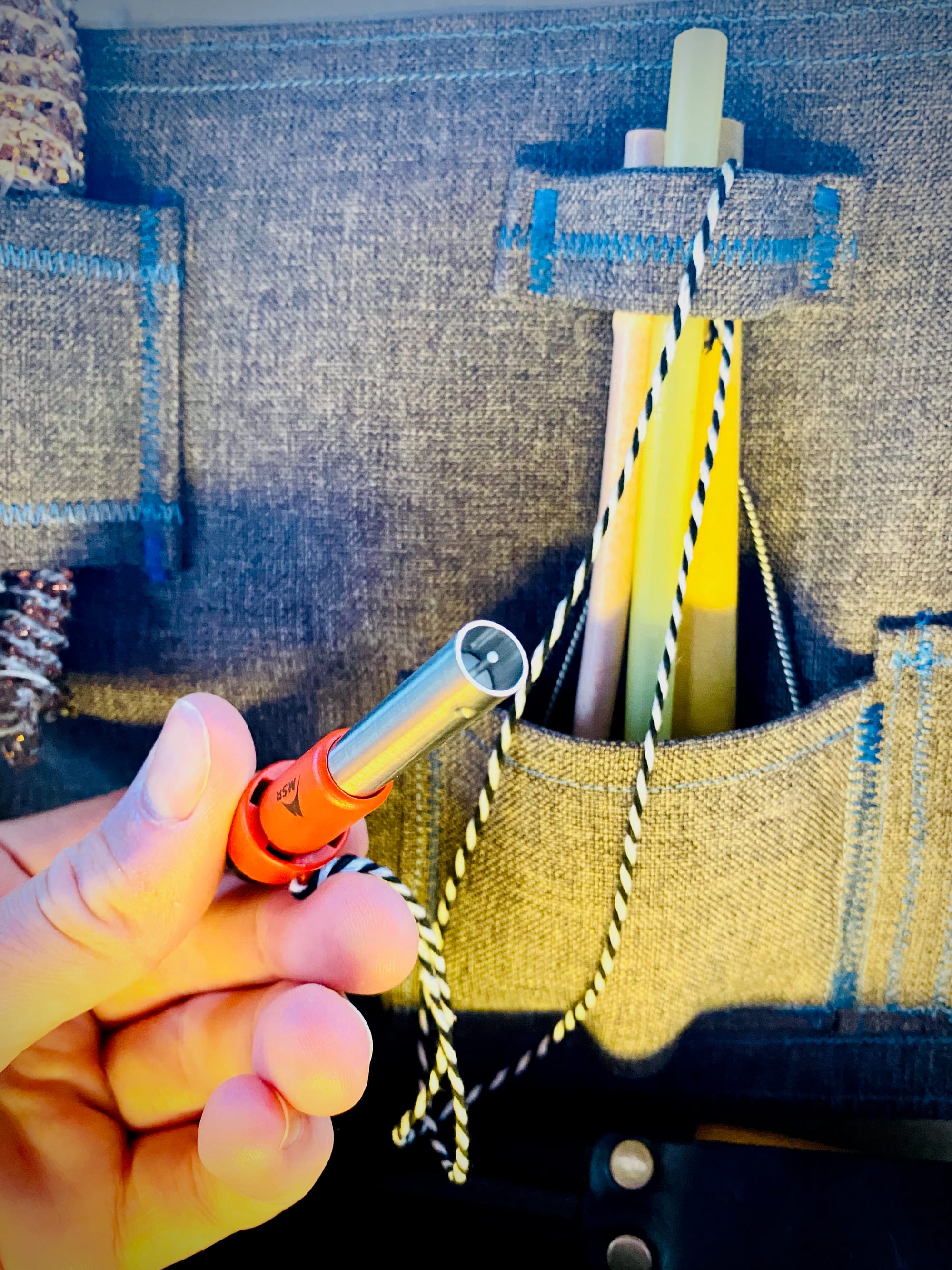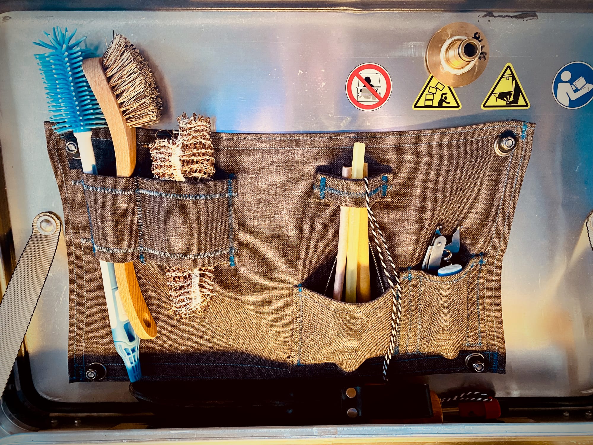 I use a self-sewn organizer to keep smaller items—like the piezo igniter for the gas stove and cleaning brushes—neatly stored and easy to find. For lighting, a USB lamp attached to the box with magnets provides convenient illumination for cooking after dark.